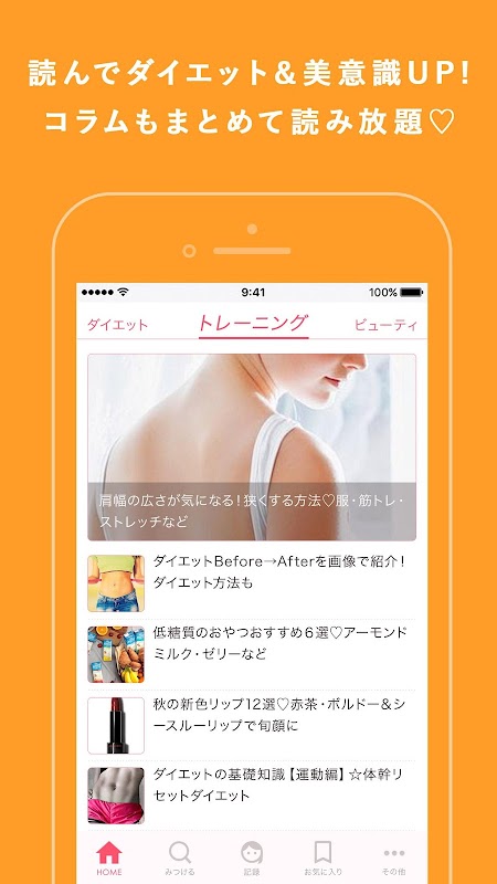 自宅でダイエット!トレーニング動画が見放題。コラムも読み放題。ダイエットを記録してあなたのダイエットをサポートするアプリです。