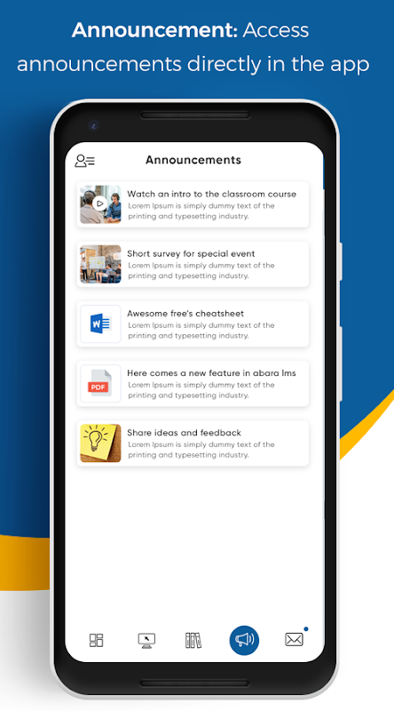 サポートされているコンテンツの広い範囲:右のアプリからアクセスSCORM(1.2と2004)コース、お知らせ、メッセージ、ビデオ、ドキュメント、およびオーディオファイル。