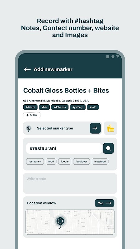 Create & customize map with marker with information like photo, notes, tag, etc.