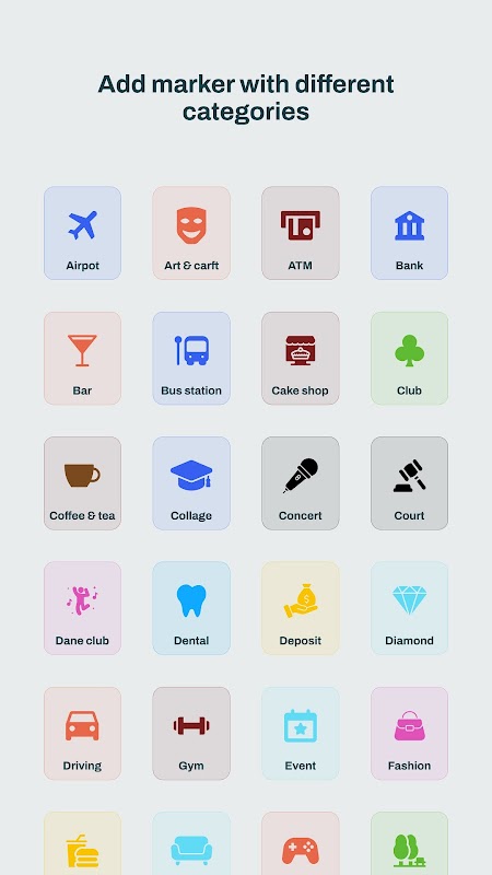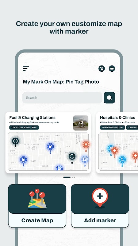 Create your unique map with your customization with pins or markers that have multiple information like - photos, number, notes, website, hashtags and more. You can choose marker with different categories.