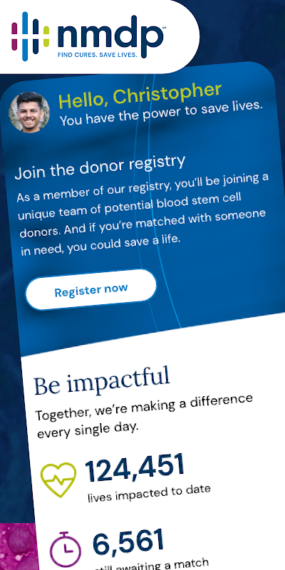 私のNMDPは、細胞療法の影響を受ける、または細胞療法を通じて命を救うことに専念する患者、介護者、ドナー、サポーターのコミュニティです。この安全なツールを使用すると、同じような他の人たちとつながり、そこから学ぶことができます。自分の旅を管理するためのパーソナライズされた機能を提供します。アカウントを使用すると、プロフィールを変更したり、専用のサポート センターに接続したりできます。 NMDP℠ の患者やドナーの感動的なストーリーや役立つリソースにもアクセスできます。