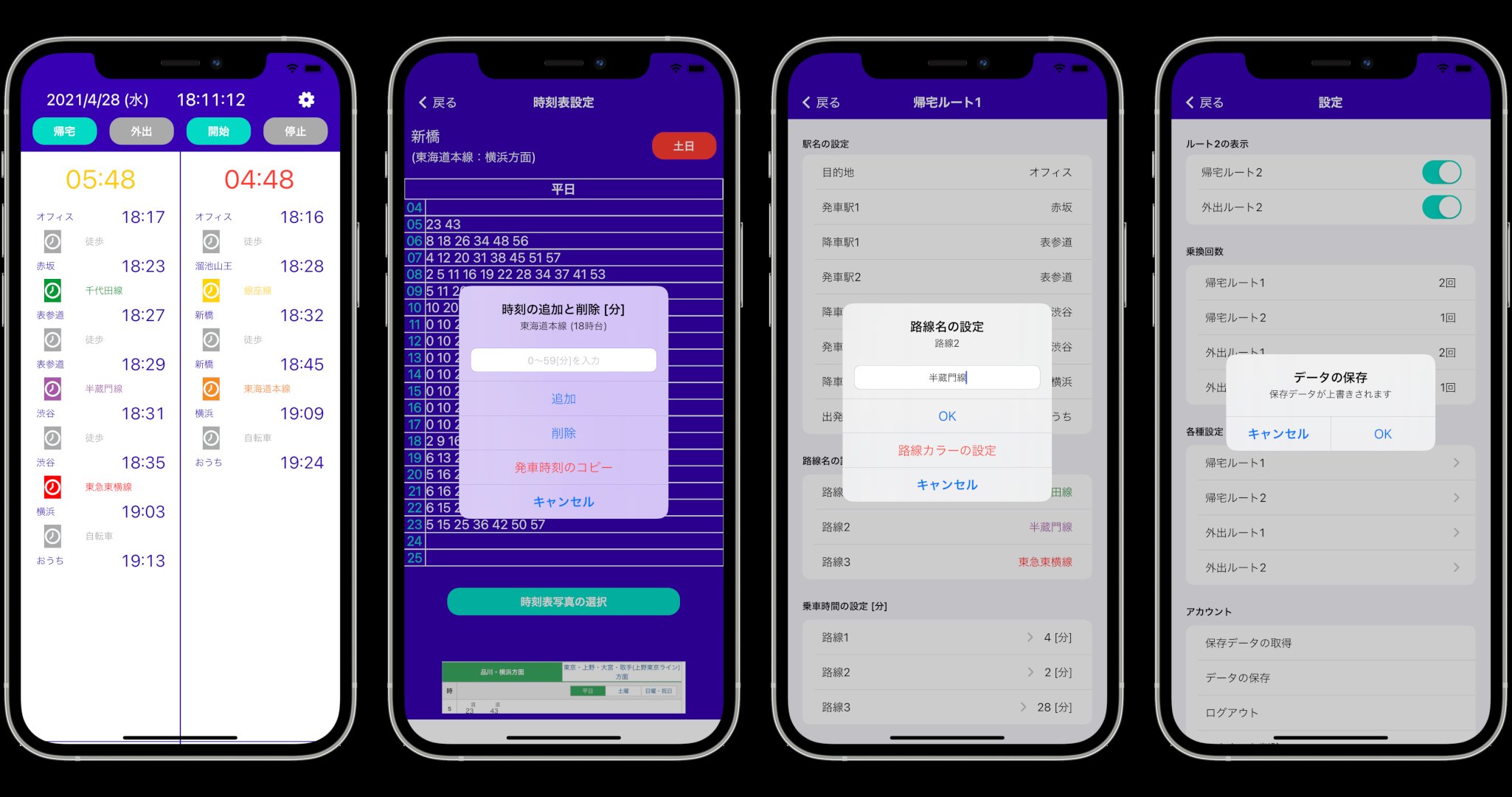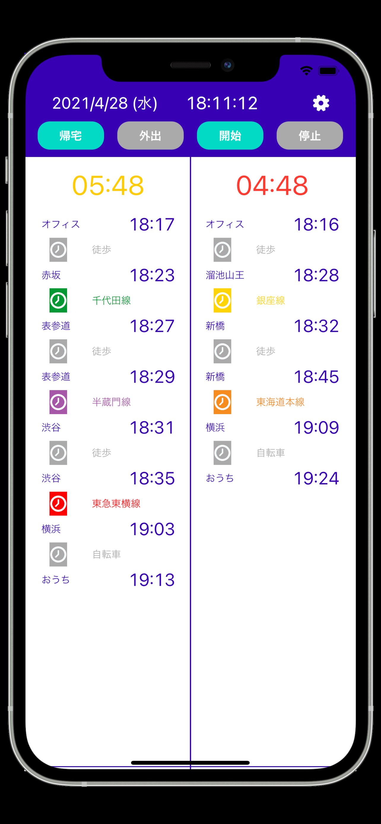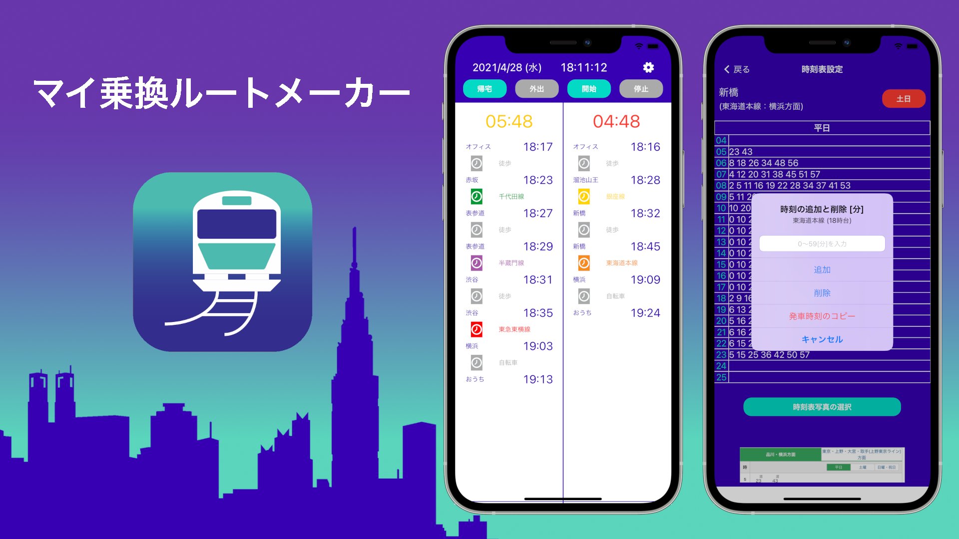 毎日の通勤通学に便利な自分だけのための乗換案内作成アプリ。出発までのカウントダウン機能、2つのルートの同時比較機能、帰宅ルートと外出ルートの切替機能があります。
