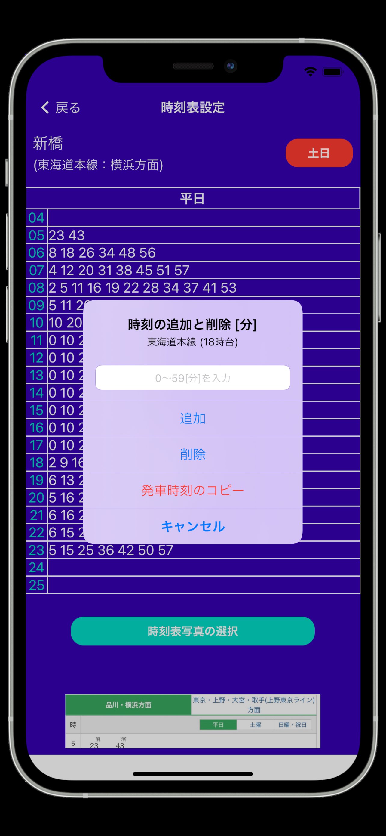 3-2) 発車時刻[分]を入力し、「登録」をタップします。欄に発車時刻が追加されます。