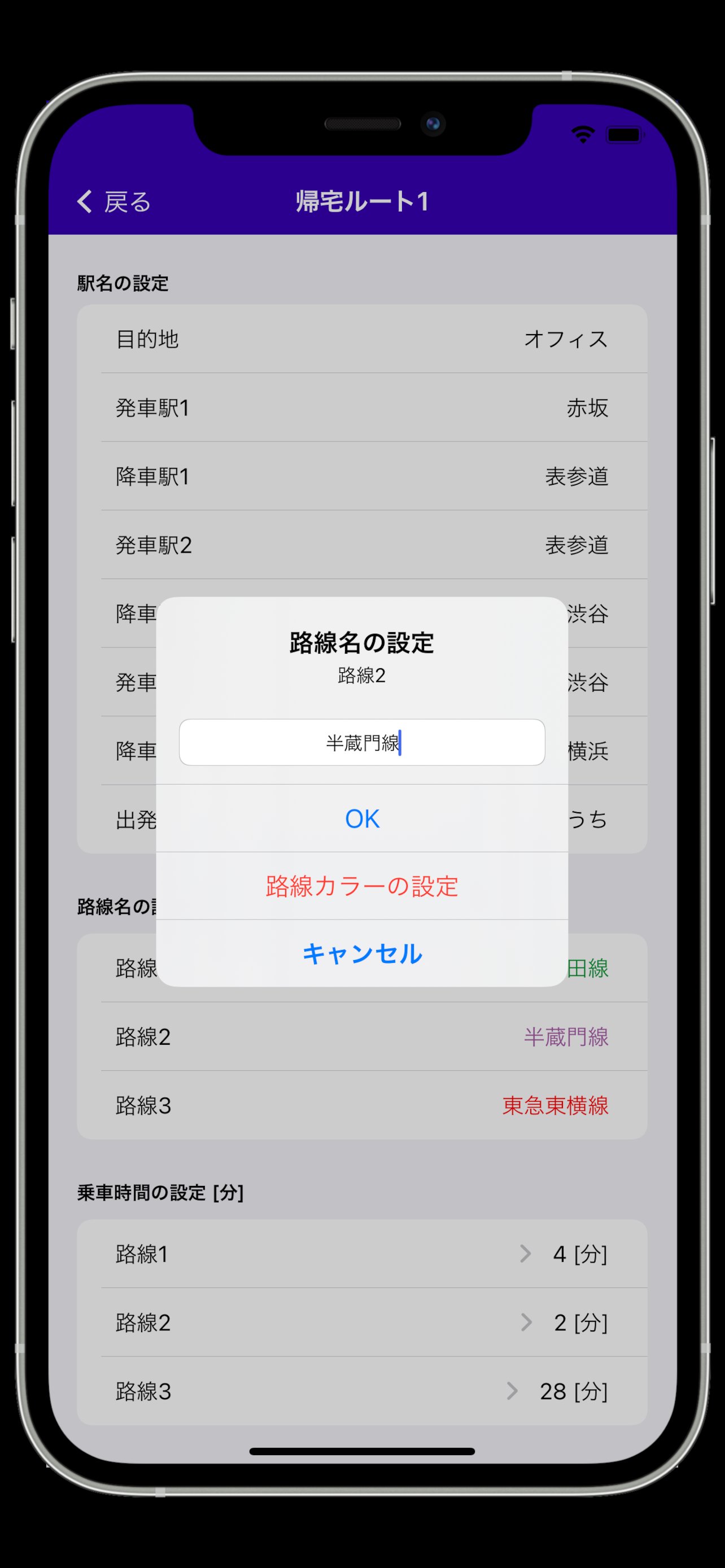 2-5) 「路線1」をタップし、路線名を入力します。必要に応じて同様の方法で「路線2」、「路線3」を設定します。路線カラーの選択をタップすれば路線カラーも変更できます。