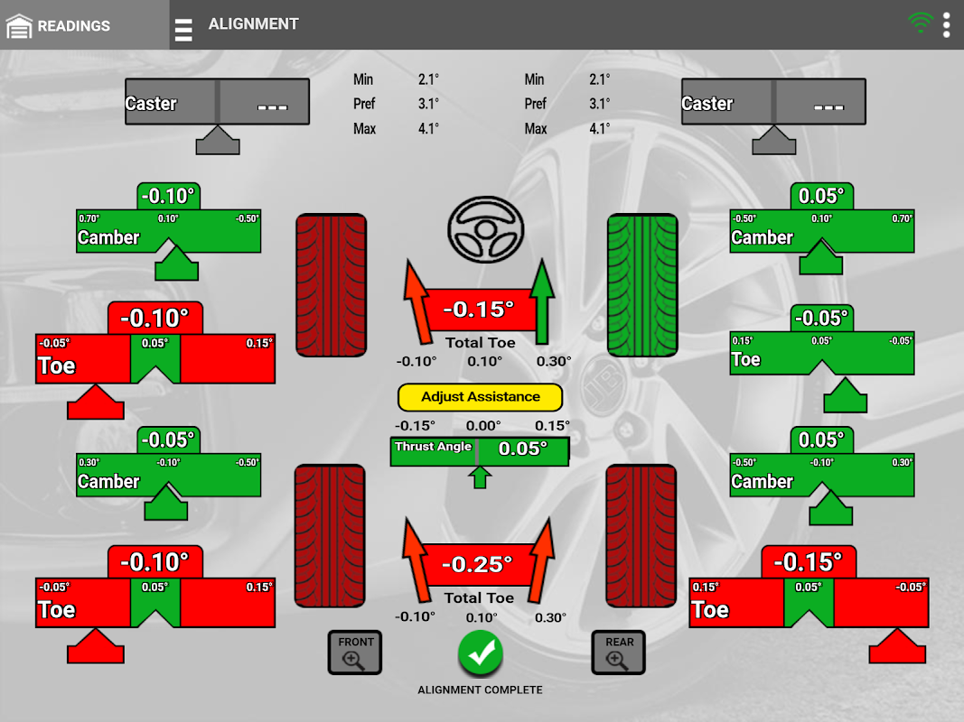 - ホイールアライナーのコンソールでアライメントの読み取り値と調整をチェックするダウンタイムを削減します。