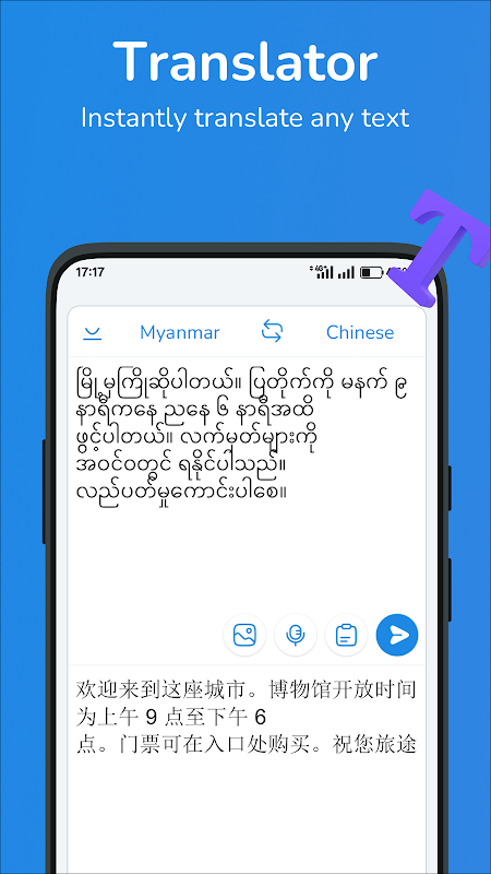 - 超高速翻訳: 複雑な段落であっても、ミャンマー語ビルマ語から簡体字中国語へ、また簡体字中国語からミャンマー語ビルマ語へ瞬時に翻訳します。