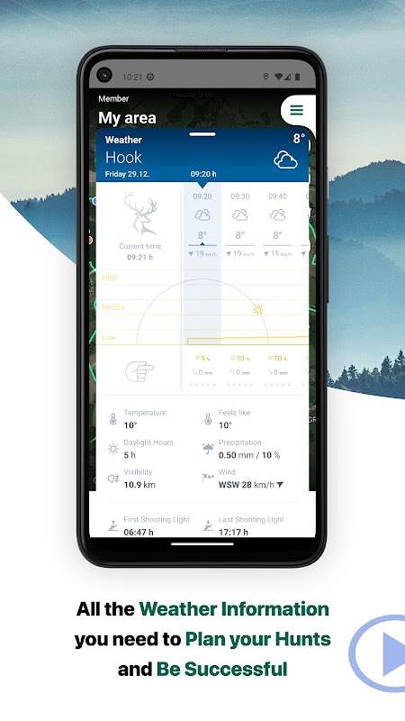 - 天気予報と雨レーダー: 時間ごとのデータ、7 日間の予報、風向と強さ、最初と最後の射撃光、および動物の行動を予測して狩猟の成功率を高めるための太陽月相が含まれます。