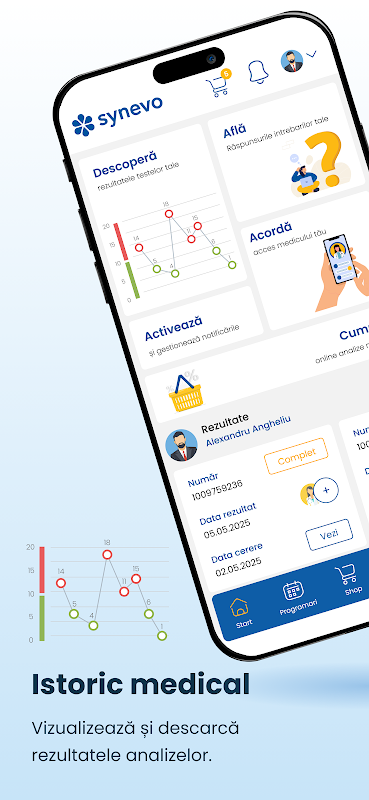 • Synevo で実施された医学分析の履歴と、時間の経過に伴う値の変化を示すグラフをいつでも確認できます。