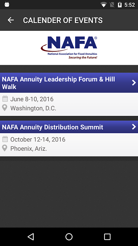 • Access the full TripBuilder EventMobile™ Apps for the NAFA Annuity Leadership Forum & Annuity Distribution Summit events to see detailed event info for each.