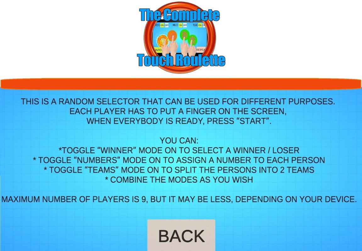 このタップルーレットの最大プレーヤー数は9人ですが、デバイスによっては少なくなる場合があります。繰り返したい場合は、「繰り返し」を押して、指をもう一度入れてください。