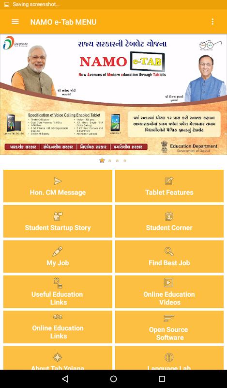 NAMO e-Tab is an Education Application. This App overcomes many study related confusion of student. It helps students of all Stream (Like Arts, Commerce, Engineering and Medical Science) to find best career information. This App is developed At Directorate of Technical Education Gandhinagar, Gujarat. It contains useful links like Know Your College (KYC), Student Startup and Innovation Policy (SSIP), Govt. Scholarship etc.,