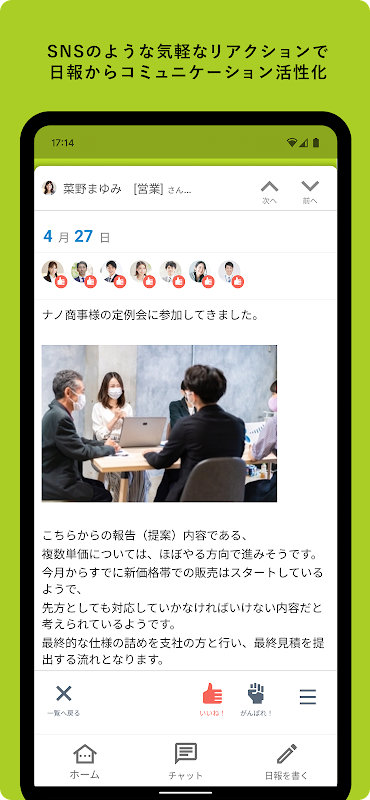 毎日登録される社員の日報を通して、お互いの業務状況、1日の仕事の振り返りや気づきをシェアしできます。SNSのように日報にリアクションでき、社員同士のコミュニケーションが活性化されることでチーム力が高まり、組織の成長につながります。