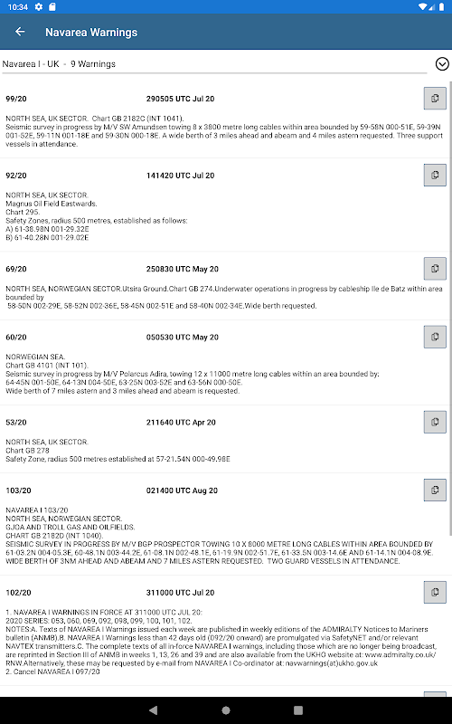 SOLAS船舶は常に最新の地域を取得するためにNavtex受信機を使用する必要がありますが、特に新しい地域に移動すると、このデータにギャップが生じる可能性があります。 Navtexはアクティブな警告番号の完全なリストのみを一覧表示しますが、古い警告の実際のテキストは一覧表示しません。我々のアプリを使うと、あなたは素早くそして簡単にこの情報を得ることができます。