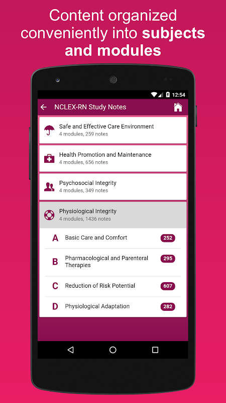 Enjoy a collection of about 2700 notes across the four subjects for NCLEX RN exam preparation, arranged by Subjects, modules and chapters. Our app is designed for young nurses to gain an edge by learning maximum in minimal time.
