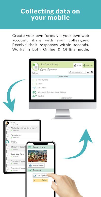 市場調査のためのオフライン調査を作成して共有するために使用できます。健康と安全の監査、検査フォームまたはアンケート。また、品質管理チェックリスト アプリとして使用したり、パンチ リストや障害リスト フォームの作成に使用したりすることもできます。アカウント所有者は、スマート デバイスを介して、現場で働く同僚からモバイル データを即座に収集できます。