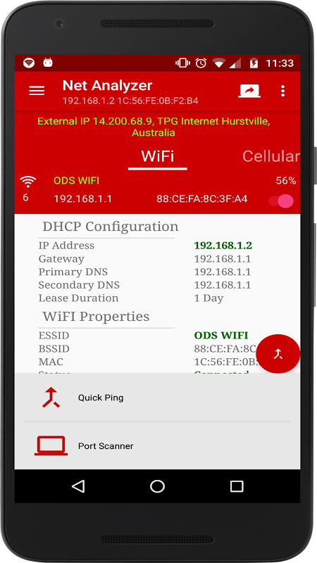 ネットアナライザは、指定されたドメイン名のすべてのIPアドレスを検索し、それぞれのサーバーの場所でそれぞれをマッピングします。これは、その瞬間に接続発見アクティブデバイスにネットワークをスキャンすることができます。また、ときにオフラインで作業するために、将来の参照のためのデータを保存します。各IPは、pingを実行することができ、その結果は、人間が読める形式に戻って与えられています。インターネットに接続している場合、アプリケーションは、IP(面した外)現在の内部(プライベートネットワーク)、IPだけでなく、外部を示しています。また、それは、テキストや画像にあるかどうか、データを共有することは簡単ではありませんでしだ。