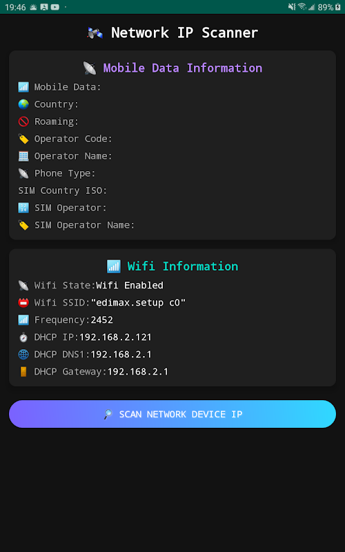 この軽量アプリは、現在接続しているWi-Fiネットワーク内のデバイスを素早くスキャンし、モバイルネットワークやWi-Fi接続の詳細情報も表示します。モダンで見やすいデザインで、初心者にも扱いやすいツールです。