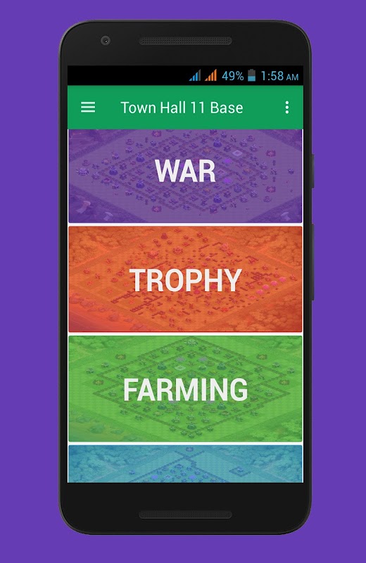It contains Maps from Town Hall 11 with three category War, Trophy and Hybrid.