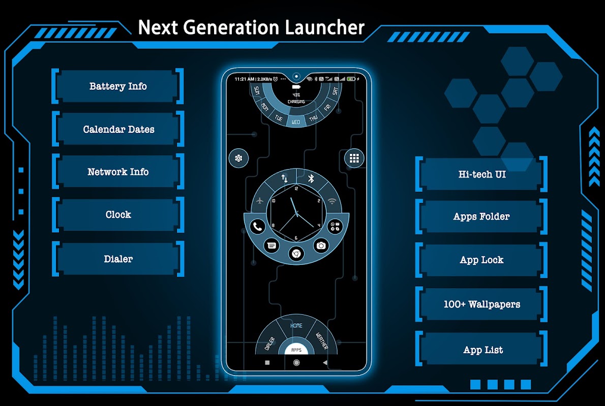 Next Generation Launcher - AppLock, HideApp, Hitech Wallpaper, Folder and Themes easy to use, stylish and offers higher performance. It stylized your phone’s home screen in future UI which gives a next generation launcher or virtual theme to your android phone.