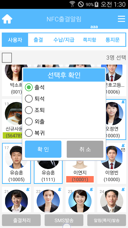 출결자동관리 : 해당 직원/알바/학생/어린이의 출결상태를 관리자가 수동으로 출결상태 변경(출석, 귀가, 조퇴, 외출, 복귀 등)