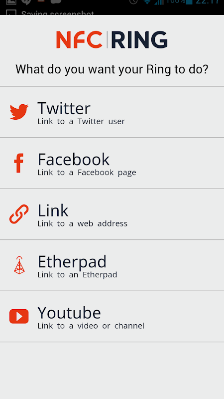 NFCRing®アプリには、Facebook、Twitter、一般的なWebサイトリンク、Etherpad、Youtubeのサポートが組み込まれています。