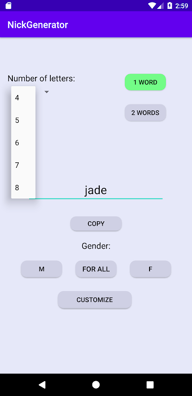 В правом углу выберите количество слов и нажмите на интересующий пол (мужской - "м", женский - "ж" или "для всех"). Если слово одно, то вы можете выбрать количество букв. После создания имени вы можете его кастомизировать, нажав на соответствующую кнопку. В конце нажмите кнопку "скопировать" , и процесс завершен.