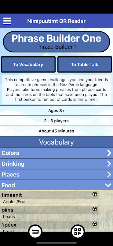 Native Teaching Aids は、物理的な Nimipuutímt 製品(カードゲームなど)用の QR コードリーダーを提供するために取り組んでいます。このアプリは、ゲームのプレイと、提供された発音とオーディオで Nimipuutímt 言語の学習の両方に役立ちます!