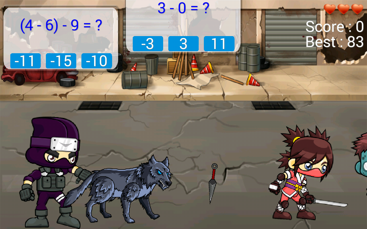 The math questions on the left are harder than the middle one. But if you answer the question in the panel on the left, the ninja girl can help you. Meanwhile, I have a warning to you that the zombies will accelerate gradually. When the zombies speed up, you may need to use both panels at the same time.