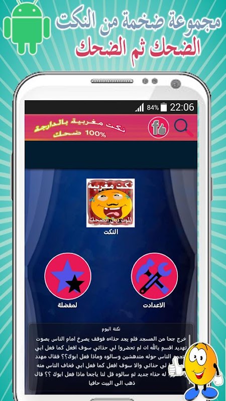 تطبيق فكاهة يحتوي على مجموعة ضخمة من النكت و الطرائف للضحك و رسم الابتسامة على وجوه أصدقائكم و أقاربكم