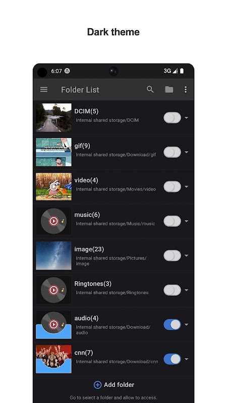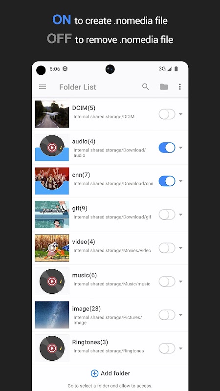 2.フォルダが「ON」に設定されている場合、このフォルダのメディアファイルはMediaStoreでスキャンされず、それ以外の場合スキャンされます。