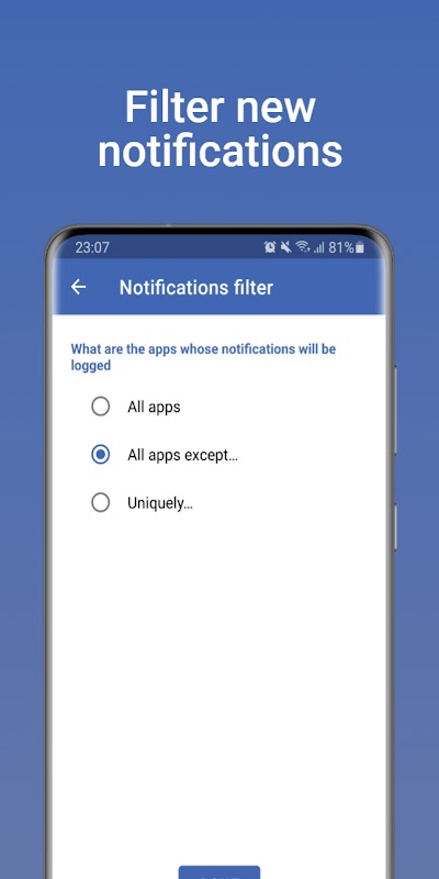 → Notification filter: You can choose to store of all apps notifications or just selected ones..