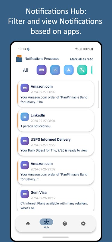 ✅ 自動非表示: 特定のキーワードを含む通知を、指定されたスケジュール内で静かに非表示にすることで、新しい通知による気の散りを防ぎます。非表示にされた通知は通知ハブに保存され、後で確認できます。