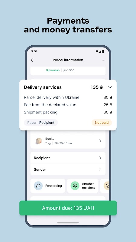モバイル アプリで送金を使用して発送を作成し、Nova Poshta 支店で銀行カードまたは現金で便利な方法でお金を受け取ります。数回タップするだけで荷物の代金を支払います。