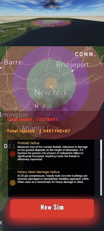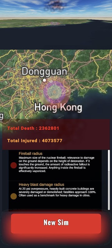 米国、ロシア連邦、中国、英国、フランス、インド、パキスタン、イスラエル、北朝鮮などの国のリストから核兵器を選択し、3D 現実世界地図上でシミュレーションして、視覚的およびグラフィック効果による影響を確認します。 リストされている国々のほぼすべての核兵器には、正確な出力 (キロトン) と、数や製造年などの追加情報が記載されています。 さらに、破壊による特定の場所に対する核兵器の壊滅的な影響と、その影響を受けた人々の数に関する統計情報を入手するため、