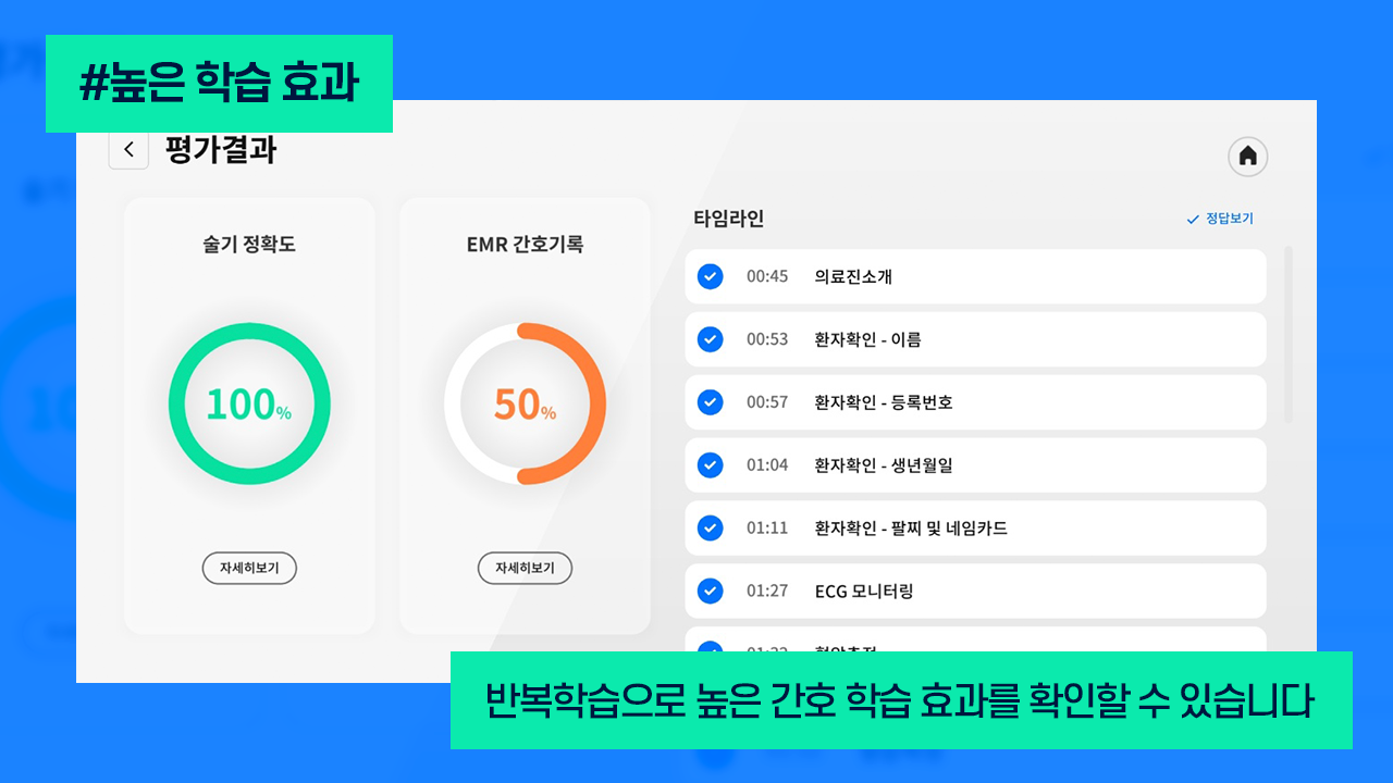 원하는 만큼 반복학습을 할 수 있는 구조로, 단기간에 높은 간호 학습 효과를 확인할 수 있습니다.