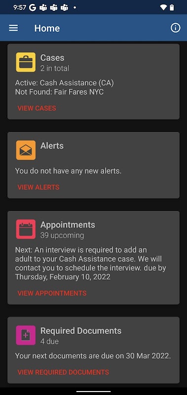 アプリの[ケース]セクションでは、SNAPまたは現金支援ケースの現在のステータス、各特典のEBT残高、および今後の再認証日を表示できます。フェアフェアNYCの割引ステータス、フェアフェアNYCの更新期間、またはアクセスアライドのステータスを追跡することもできます。