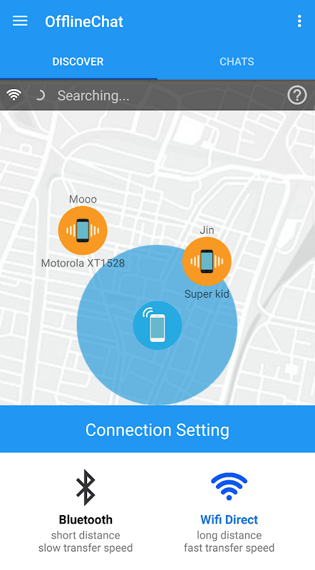オフラインチャットは100m周辺のユーザーが他のユーザーを発見し、インターネットやモバイルデータ接続せずに、ピア - ツー - ピア(P2P)接続を作成することができる通信アプリケーションです。すべての通信は、無線P2P技術を使用して実行されます。