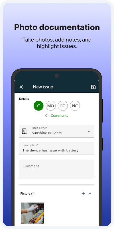 •重大度、コメント、および写真を使用して問題または調査結果をデジタルで報告し、適切な担当者によって修正されていることを確認します。