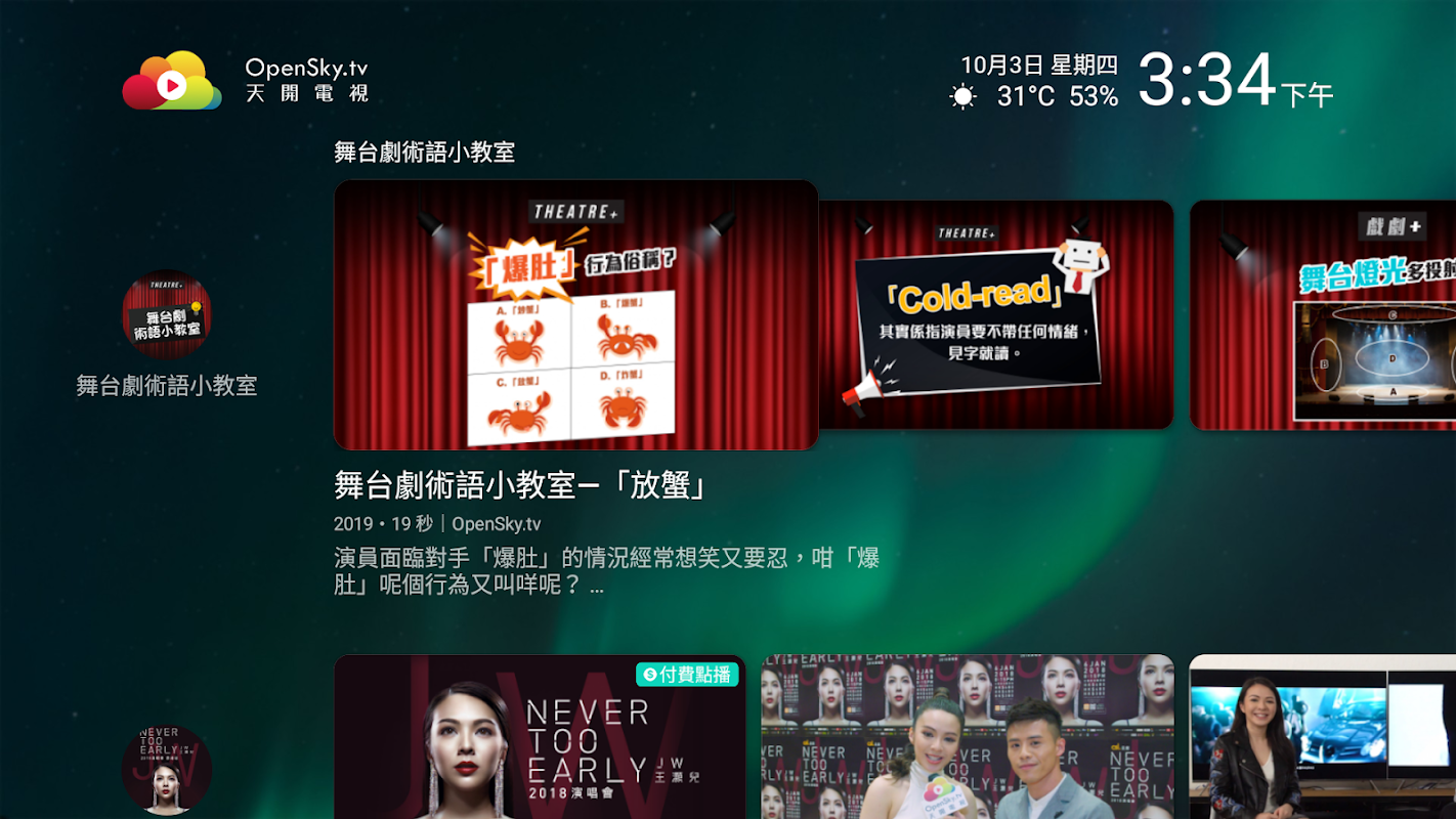 OpenSky破天荒與舞台劇界合作,打造全港首個舞台劇視頻平台,致力推廣戲劇文化。我們積極搜羅優質戲劇作品,為舞台劇迷提供最全面劇訊。同時,為提供更豐富及多元化內容推介,OpenSky亦會繼續精選娛樂盛事,讓本地及全球觀眾同步欣賞高質素的視頻直播及點播,配合智能內容推介技術,帶來嶄新跨平台地域的視聽娛樂新體驗!