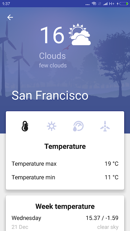 OpenWeatherは現在の温度、現在の日、日の出と日の入りの時間、圧力、湿度の最大値と最小温度、風の速度と方向として、気象に関するこのような情報を提供します。