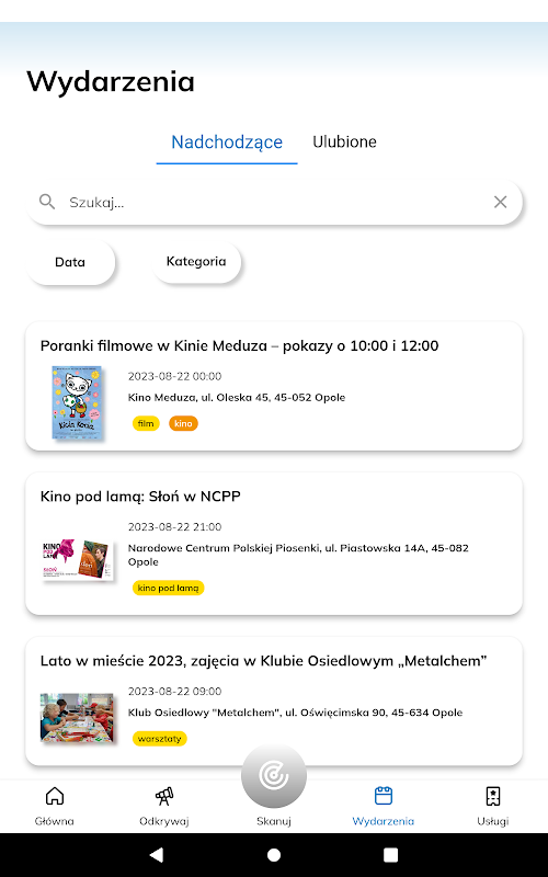 このアプリケーションの利点は、明確なインターフェイス、シンプルで直感的な操作です。 3 つのセクション (検出、イベント、サービス) により、ユーザーは Opole+ の操作方法を簡単に見つけて、不必要な複雑さを生じることなく利用可能な機能を使用できるようになります。
