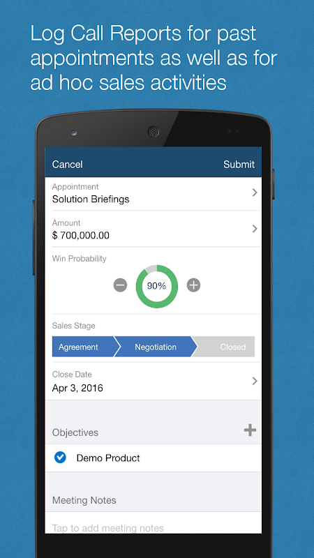Oracle Sales Cloud Call Report app is a single purpose app that enables sales rep to perform critical and frequent tasks in a minute or less. With Call Report app, you can: