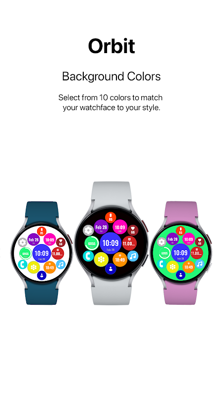 カスタマイズオプション: 動的カラー: 独自の外観を得るために各円の色を調整します。 テキストカラー: 最適な可読性のために30種類の異なるカラーバリエーションから選択します。 背景色: スタイルに合わせてウォッチフェイスをカスタマイズするために10種類の色から選択します。 二重円層: 各円には、深さとコントラストを追加するためにカスタマイズ可能な10種類の色を持つ小さな円が含まれています。 8つのカスタマイズ可能な合併症 Orbitでは、常に表示される情報と機能を自分で決めることができます。8つのカスタマイズ可能な合併症は次の情報を表示できます: ✅ 日付と時刻 – 日、日付、または追加のタイムゾーンを表示します。 ✅ 天気 – 温度、降水確率、またはUV指数を表示します。 ✅ 健康とフィットネス – 歩数計、心拍数、消費カロリーなど。 ✅ カレンダーとリマインダー – 予定やタスクを把握します。 ✅ バッテリーレベル – バッテリーの状態を追跡します。 ✅ ミュージックコントロール – トラックを迅速に再生、一時停止、およびスキップします。 ✅ ストップウォッチとタイマー – ストップウォッチやカウントダウンタイマーを瞬時に開始します。 ✅ ショートカット – 1回のタップでお気に入りのアプリを開きます。
