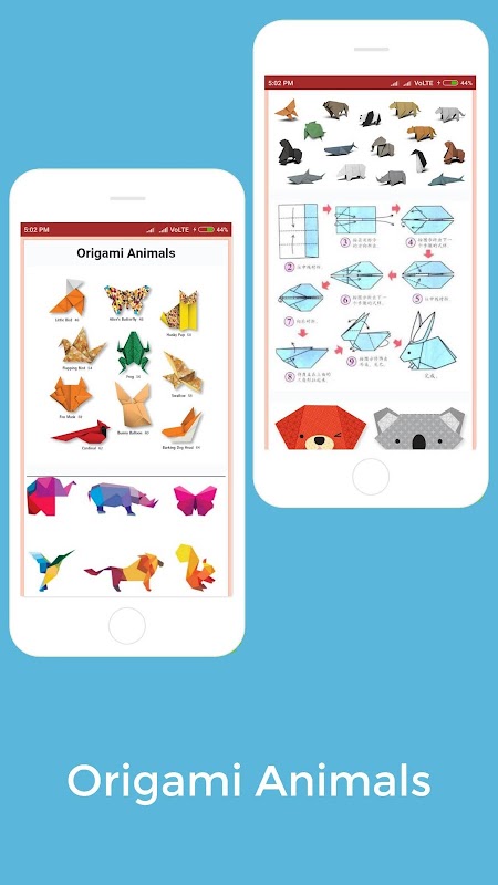ドラゴン、マティス、パガサス、スコルピオン、ラクダ、牛、カメリオン、ニワトリ、コロコダイル、カニ、クレーン、ザリガニ、カラス、犬、象、エンゲルフィッシュ、フライング、ギブボーン、キリン、カモメ、ハムスターの折り方を学ぶことができます、カバ、馬、ライオン、サル....など...