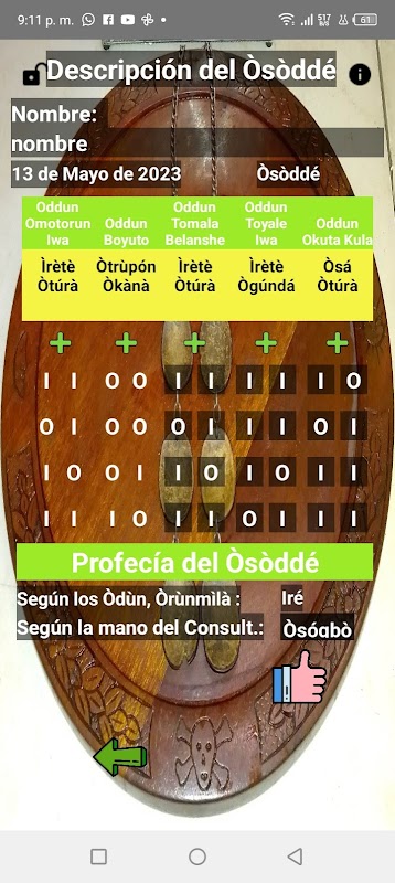 これらには、それぞれの人に示されるヒントの記録に加えて、オニッシュ、エボシ、ヒント、オリシャ・アルグバからオリ、統治し随伴するオリシャ(オドゥン・バワ)など、同じ人のさまざまな特徴が記録されています。オソデ 。オルンミラがケースごとに発行したオドゥンを登録することもできます。