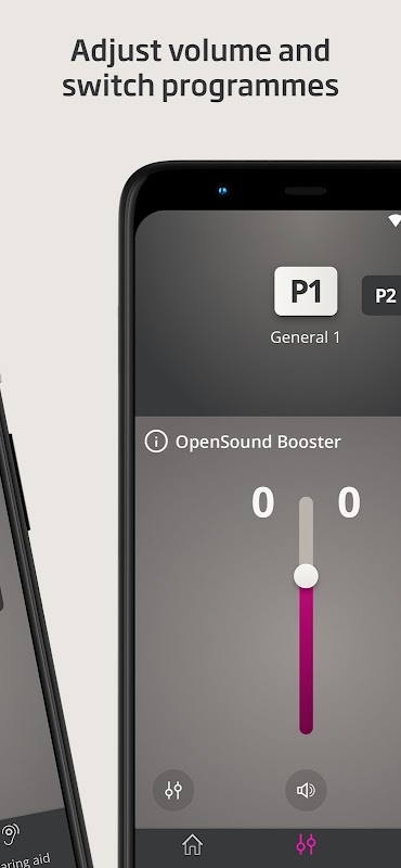 オーティコンオンアプリは、補聴器の音量調節、補聴器プログラムの切り替え、電池残量の確認、補聴器の紛失時に補聴器を探すといった機能を操作できます。
