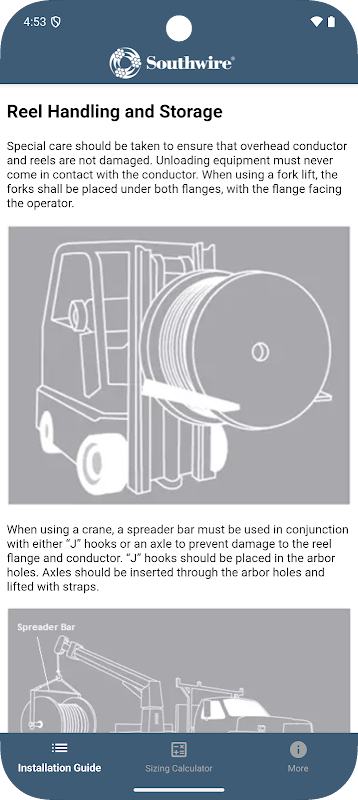 このアプリは、架空送電線の設置に関するSouthwireの推奨事項を提供します。これは、現場でのインストールに成功するために必要な情報を提供する便利な方法です。