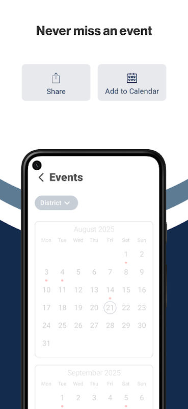 イベント セクションには、地区全体のイベントのリストが表示されます。ユーザーは自分のカレンダーにイベントを追加し、ワンタップでそのイベントを友人や家族と共有できます。