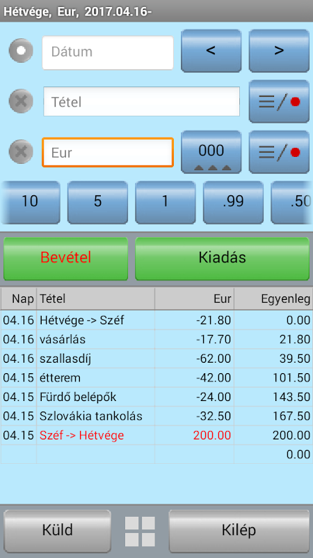 このアプリケーションでは、pénzmozgásainkat(収益及び費用)を容易に記録しました。