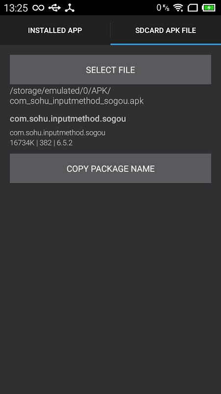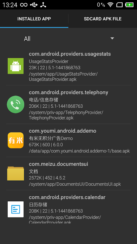 Include package name, label, size, versionCode, versionName, launch Activity name, apk file path. Can copy this info to Clipboard and export APK file to SDCard.